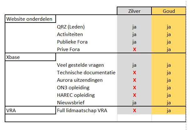 Het Zilver lidmaatschap is gratis en geeft je een beperkte toegang tot de website. Het Gouden lidmaatschap geeft je full-access tot de website en alle activiteiten van de Vlaamse Radio Amateurs.